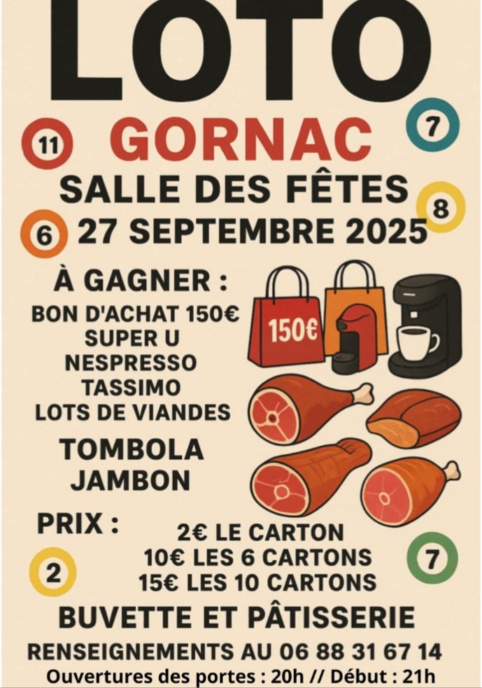 Le comité des fêtes de Gornac organise un loto samedi 27 septembre à la salle des fêtes de Gornac à partir de 20h. Buvette et patisseries sur place.
