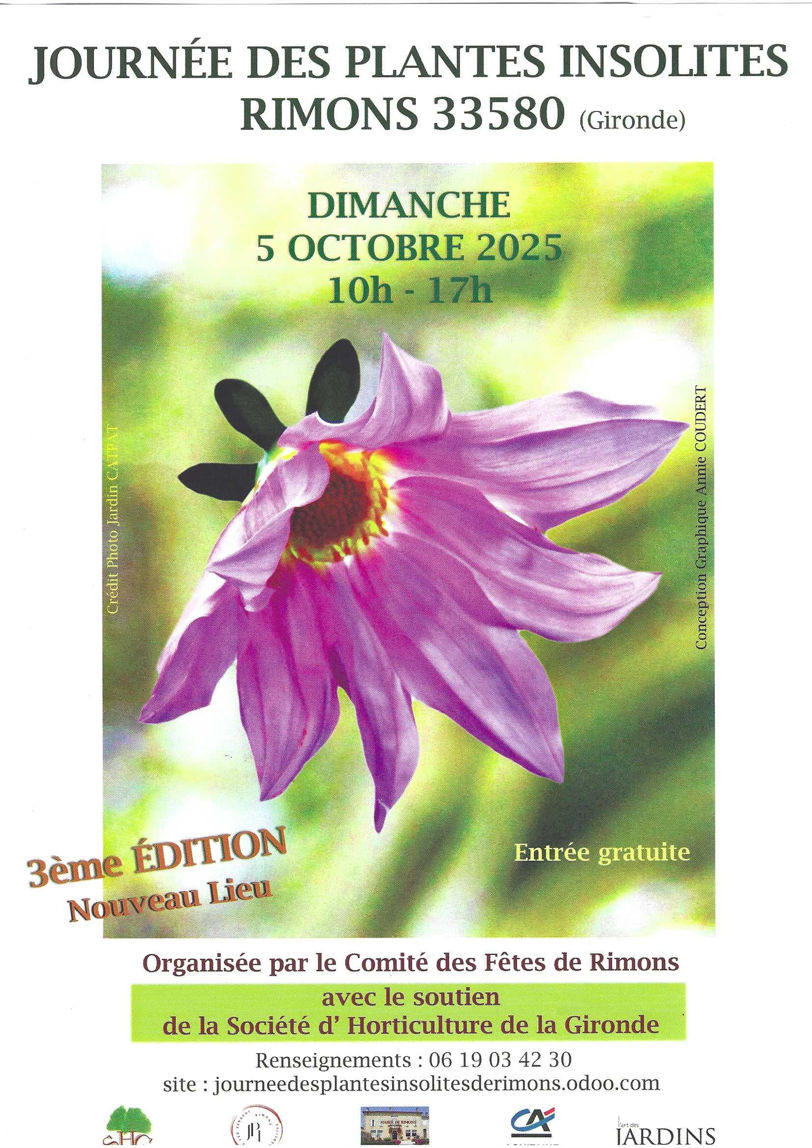 Le Comité des Fêtes de Rimons avec le soutien de la Société d'Horticulture de la Gironde organisent une journée des plantes insolites dimanche 5 octobre 2025 de 10h à 17h. Accès facile. Entrée et parking gratuits à proximité. Buvette et restauration sur place.