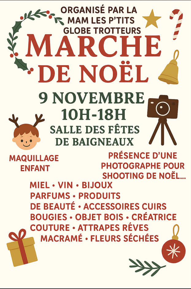La MAM" Les p'tits globe trotteurs" organise un marché de Noël le 9 novembre de 10h à 18h à la salle des fêtes à Baigneux.